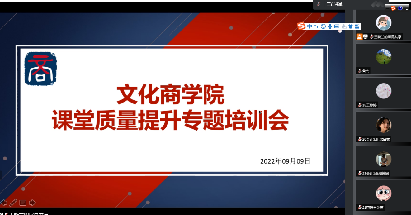为进一步提升学院教育教学质量,有序推进课堂质量提升行动方案的实施,9月9日中午,文化商学院线上组织召开面向学生层面的课堂质量提升培训会。学院党总支副书记吴燕霞、副院长曾兴,学院所有班级的教学信息员及教务科相关教师参加了会议。