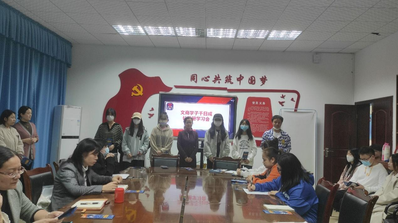 为优化教育教学管理,更好地为教师和学生做好服务,文化商学院于2022年10月27日在温故楼三楼会议室举行了文商学子千日成长手册学习会。会议由文化商学院副院长曾兴主持,文化商学院党总支书记王维姝、文化商学院党总支副书记吴燕霞、教务科、学工科老师以及文化商学院学生代表参加会议。