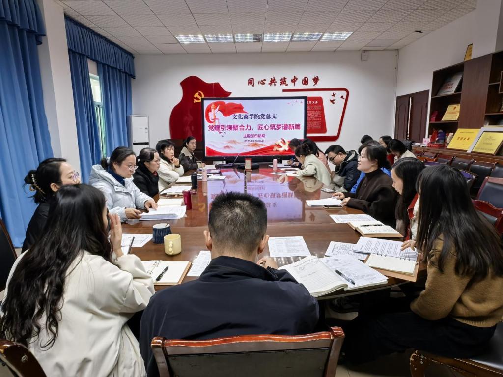 2025年12月26日,文化商学院党总支在温故楼三楼会议室开展“党建引领聚合力 匠心筑梦谱新篇”主题党日活动,全体党员参会,活动由党总支副书记吴燕霞主持。