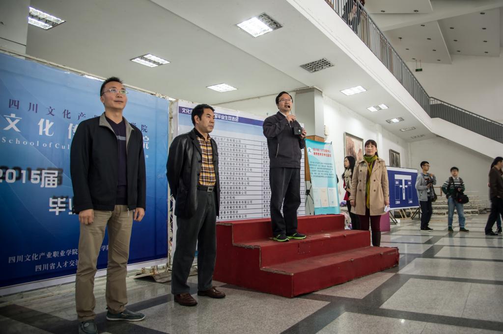 彭德惠主持双选会开幕式。她说:“过去一年,我院就业工作取得了良好的成就,11级毕业生就业率高达98%,相信此次双选会后会有更多毕业生顺利进入企业,找到满意的工作。”随后,罗晓东在致辞中说道:“今天下雨,用四川话来说就是‘落湿’,这是个好寓意,证明同学们找工作的事儿都能落实。”话音刚落,同学们便为罗院长风趣的讲话报以热烈掌声。罗晓东还用“文工”、“文将”、“文师”、“文帅”四个词对同学们提出了期望,希望同学们能在双选会上展示才能,找到满意的工作,也希望企业、学校、学生都能皆大欢喜。最后,王泗德宣布文化传播学院2015届毕业生双选会正式开始。