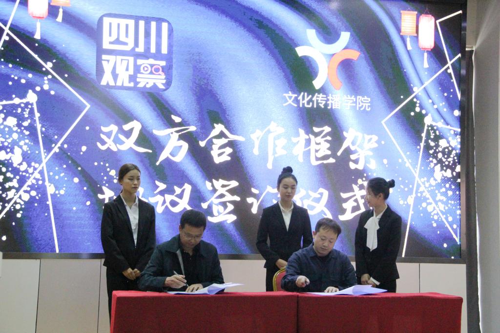 9月20日中午,文化传播学院与四川广播电视台《四川观察》在图书馆四楼举行校企合作签约仪式暨第六届全媒体新闻采制大赛颁奖典礼。文化传播学院党总支书记、院长郭光海,《四川观察》执行总编辑岳学渊出席仪式,学院各科室负责人、相关专业负责人及部分教师、学生代表参加。