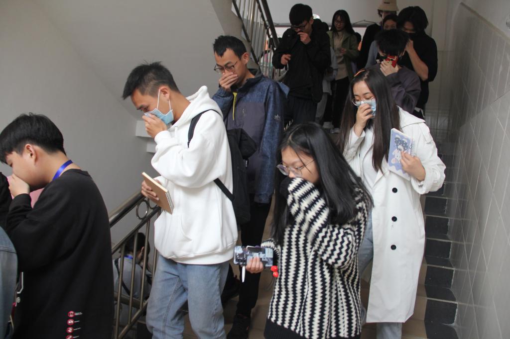 会上,主持人对相关防火知识进行普及,并讲解“迅速撤离法”、“低身前进法”、“毛巾捂鼻法”等逃生方法,解释干粉灭火器原理和使用方法,展示灭火步骤。演练现场,警报拉响后,指挥人员沉着冷静,全体师生反映敏捷,用湿毛巾或手捂住口鼻,将身体放低,迅速、有序地进行疏散,并按应急逃生路线紧急撤离教学楼,在三教楼下应急集合点整队集合。