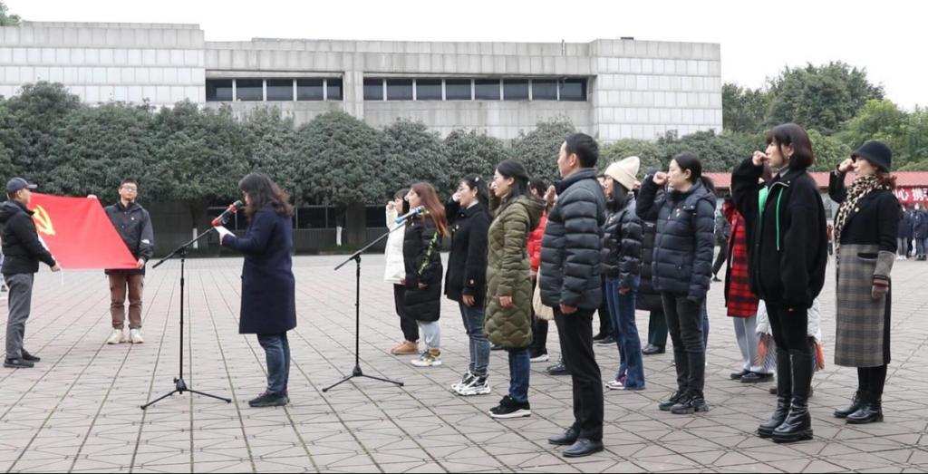 走出展馆,全体党员教师在中流砥柱馆的小广场上,党员举起右手,由宣传组织委员引领,在鲜红的党旗下庄严重温了入党誓词。各党小组分别参观了抗战老兵手印广场、川军抗战纪念馆、邓公祠、红军长征在四川等场馆,开展了形式多样的主题文艺活动。第一党小组和第二党小组激情洋溢地朗诵了满载百年中国梦想的诗歌《一叶红船》。第一党小组党员张浩在川军抗战馆声情并茂地给大家讲解了川军各派系响应刘湘出川抗日号召,整装待发,出川杀敌。作为祖国的大后方,巴蜀儿女踊跃保家卫国,出了三分之一的军粮,出了三分之一的钱币,出了三百余万战士,出了三百余万工役,艰难困苦,始终不渝,直到把日本侵略者驱逐出境。第三党小组党员认真参观建川博物馆红手印广场,了解抗战故事,声情并茂地朗诵诗歌《我爱你中国》,表达了对祖国母亲赤诚的热爱、对抗战英雄由衷的崇敬与感激。第四党小组在参观“红军长征在四川”一个个逼真的复原场景时,触景生情,朗诵了长征组歌中的“过雪山草地”,参观红军过草地的苦难历程后,深情演唱了《我的祖国》。