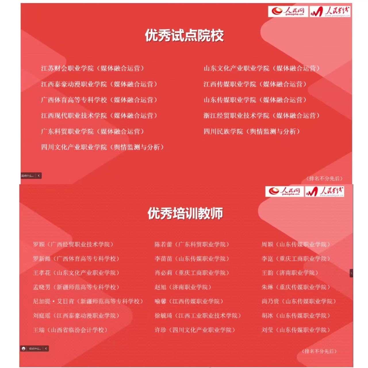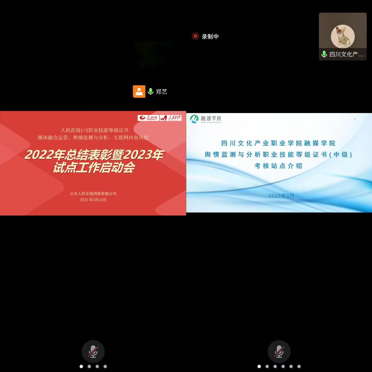 3月14日,人民在线1+X职业技能等级证书2022年总结表彰暨2023年试点工作启动会在腾讯会议进行。融媒学院荣获“优秀试点院校”称号,副院长唐颖作为“优秀试点院校”代表,在会上作经验分享,网络舆情监测专业主任许珍荣获“优秀培训教师”称号。