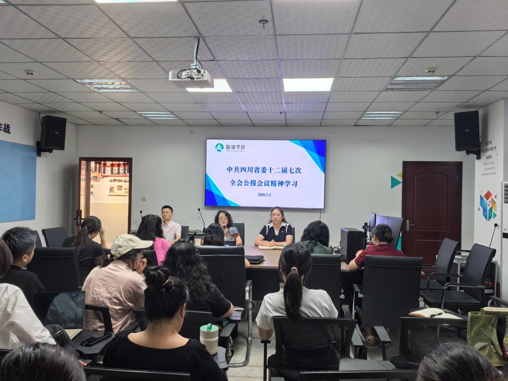 近日,融媒学院在图书馆7楼会议室召开专题会议,深入学习贯彻中共四川省委十二届七次全会精神,党总支书记卢隽主持会议,全体教师参会。