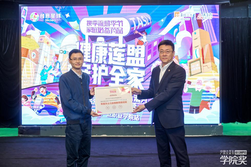 随后,天士力集团市场总监田建民向学院授予“中国大学生广告艺术节学院奖2025秋季征集大赛·天士力实践成果”证书,此举不仅是对学院实践教学成果的认可,也为校企合作育人、项目共建方面奠定合作基础。
