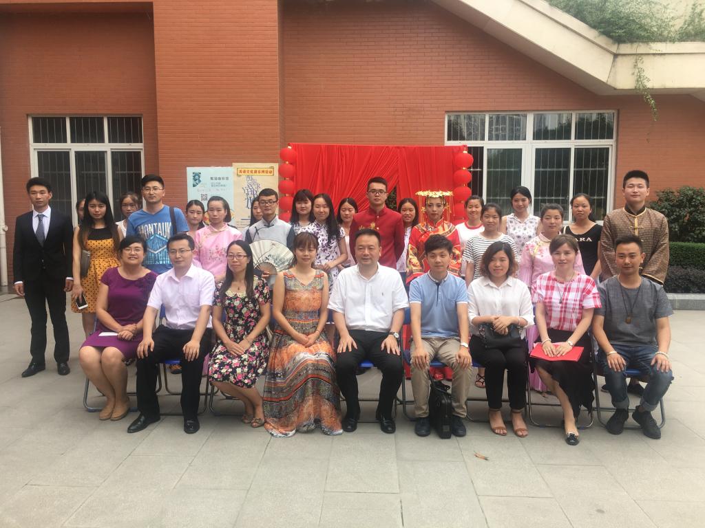 在学校图书馆楼下,随着现场歌曲《琴瑟和鸣》响起,身穿传统中式服装的“新郎”深情款款地走向“新娘”,在在主持人的安排下,“跨火盆、跨马鞍、拜天地、合卺酒”, 一场传统的中式婚礼拉开序幕,全过程由24位婚庆专业的同学自导自演完成。