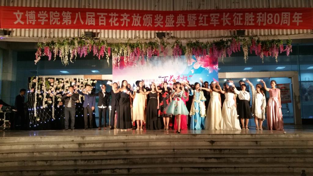 主题活动上颁发了“梅”“兰”“竹”“菊”四个奖项,并进行了展示,充分展现了文博学子的专业风采和艺术造诣,之后的歌曲串烧表演使整个活动进入了高潮。在举行换届交接仪式时,第八届学生会主席彭祥宇的发言让在场师生无不动容,从他的话语中流露出了一个毕业生对母校、对同学、对老师深深地不舍,展现了一个优秀学子在即将离开校园时对未来的无限憧憬和对母校衷心美好的祝福。