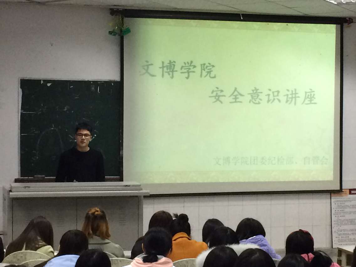 12月15日,我院在第一教学楼一阶梯教室举办了第八届安全意识讲座。讲座内容为大学生在人生安全、财产安全、寝室安全等方面需要注意的问题和如何保证安全。讲座上,纪检部干部冯国瑄通过社会真实案例分享让同学们充分认识了大学生活所会面临的一些安全问题。自管会干部杜浩通过播放视频,给同学们讲解了大学生寝室安全的相关注意事项,并通过具体案例,告知同学们遇到安全问题应如何进行正确处理,避免安全事故发生和受到伤害。