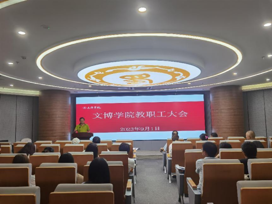 9月1日下午,文博学院新学期教职工大会在图书馆九楼会议室召开,文博学院党总支书记唐天卿主持会议,院长岳湛、副书记刘林和全体教职工参加大会。