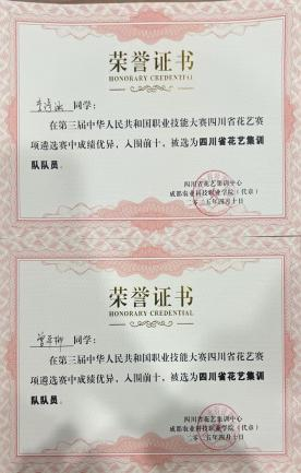 近日,文博学院婚庆服务与管理专业学生在第三届中华人民共和国职业技能大赛四川省花艺选手遴选考核中大放异彩。经过激烈角逐,我院学生曾平柳、李诗涵凭借精湛的花艺技能和卓越的表现力在众多参赛者中脱颖而出,入选四川省集训队队员。