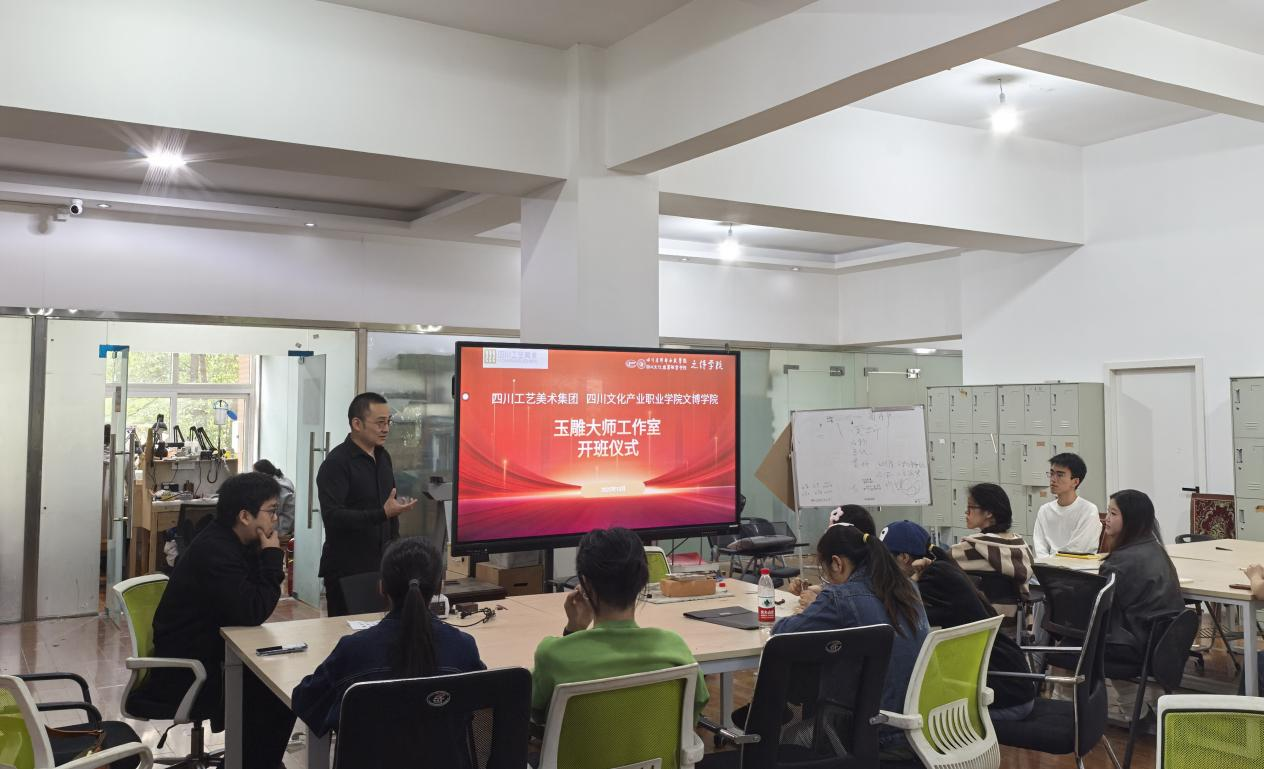 2025年10月19日下午,我校文博学院与四川工艺美术集团(以下称“集团”)联合建设的玉雕大师工作室在创汇楼201室举行开班仪式。集团高级玉雕师胡腾、专业主任何燕以及10余名玉雕班学员参加了开班仪式。