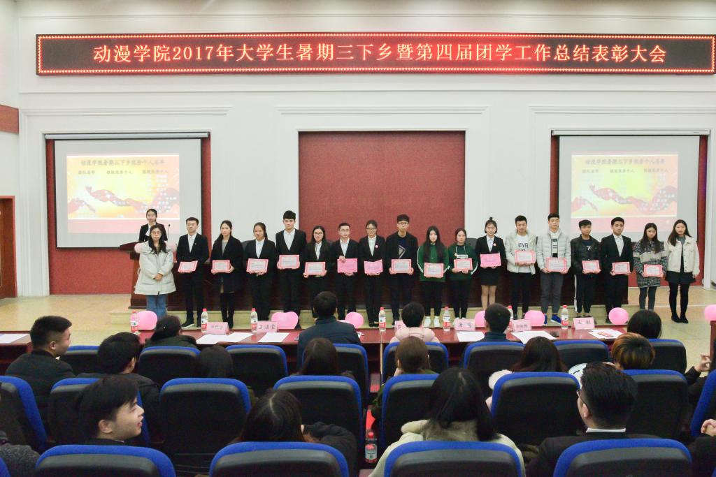 12月12日下午,动漫学院在第二教学楼105会议室举行2017年暑期三下乡暨第四届团学工作总结表彰大会。动漫学院党总支副书记罗丽、副院长余社桥、分团委书记唐雷、辅导员及部分学生代表参加了本次活动。