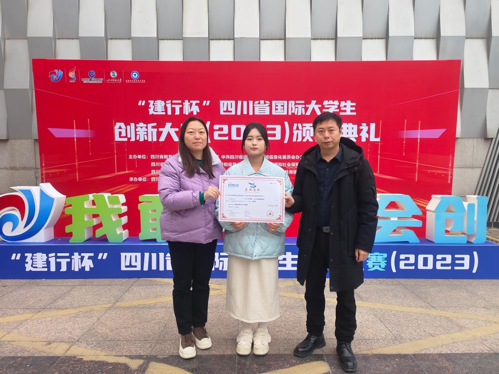 2023年12月30日,由四川省教育厅、中共四川省委统战部、中共四川省委网络安全和信息化委员会办公室、四川省发展和改革委员会等主办的“建行杯”四川省国际大学生创新创业大赛(2023)颁奖典礼在四川师范大学成龙校区举行,我院师生团队荣获铜奖。