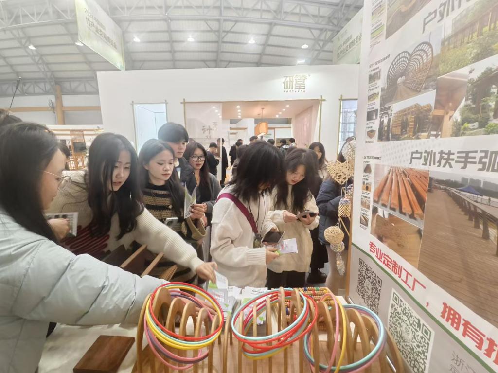 随后,詹颖带领数字媒体艺术设计专业主任李腾、环境艺术设计专业主任郑阳、室内艺术设计专业主任唐明利及专任教师冯妮娜、汪奂谦、罗加、舒馨组织学生分组分批参观竹制品销售展位,对热门产品进行现场点评和分析,并就大三学生的毕业选题进行指导。2022级数字媒体艺术设计2班何娜同学说道:“竹博会的展品和展示形式为我在毕业设计主题选择和表现手法上提供了灵感,同时竹文化的内涵也启发我在设计中要加强与文化的融合。”