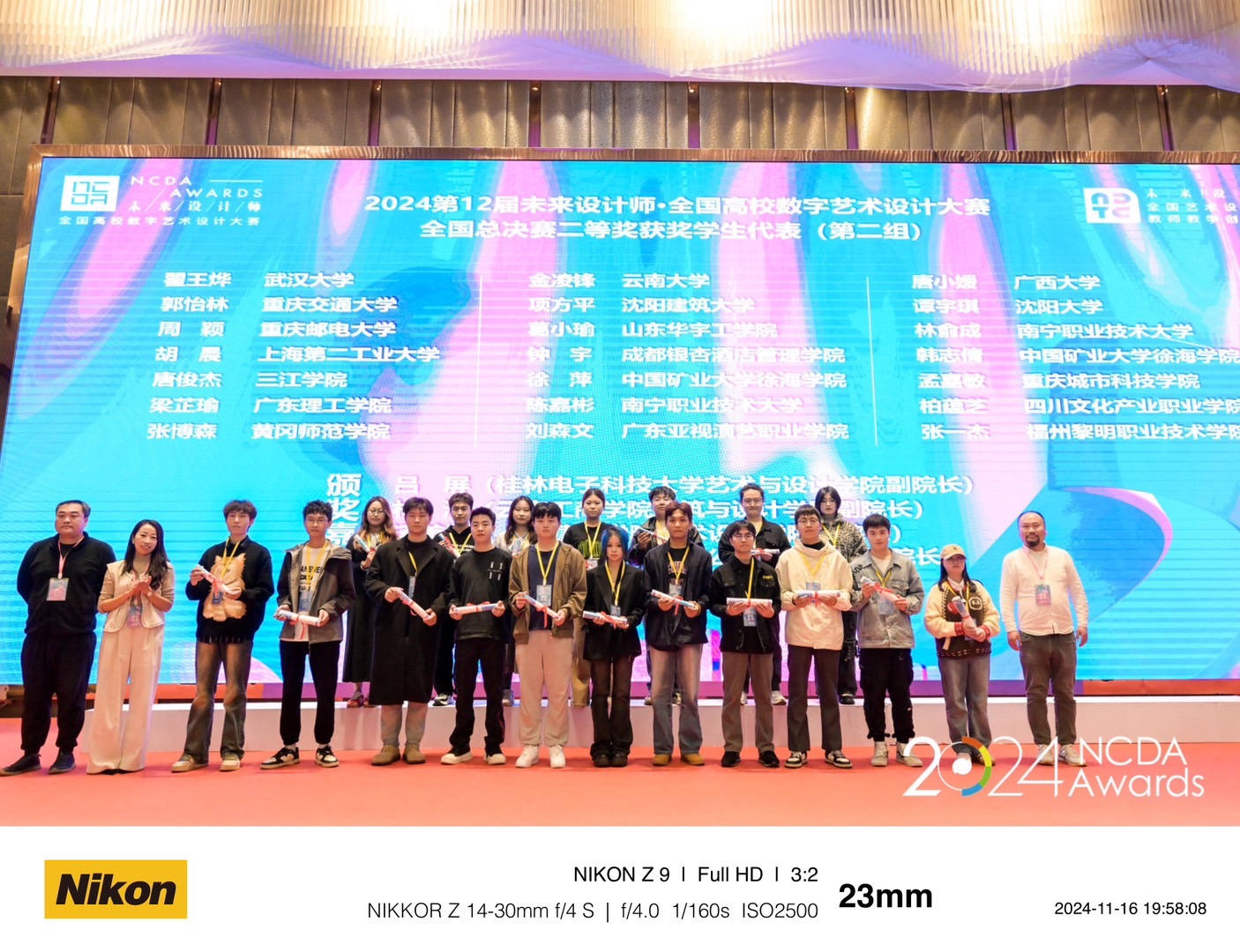 2024年11月16日,2024第12届“新质设计·创智未来”设计教育论坛暨2024未来设计师·全国高校数字艺术设计大赛(NCDA)颁奖典礼在重庆举行,艺术设计学院学子获得国赛、省赛多项奖项,其中环境艺术设计专业柏蕴芝同学获得全国总决赛二等奖的佳绩,环境艺术设计专业主任郑阳获得国赛、省赛优秀指导教师奖。