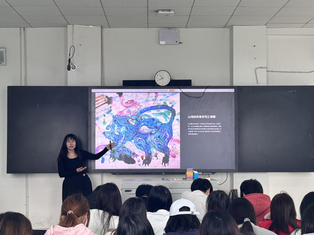 杨慧琼以“山海经为钥 开启品牌之路”为题。讲座中,她首先梳理了《山海经》主题艺术展览的发展脉络与全球展出概况,深度溯源《山海经》经典文化符号,细致拆解“龙生九子” 的神话本源、文化寓意与形象内涵,同时结合自身实战经验,讲解如何将上古山海文化IP转化为现代品牌设计语言。在交流环节中,同学们就传统文化的现代转译、AIGC在设计中的应用等问题踊跃地提问,杨老师耐心解答了问题,并给予大家热情的鼓励。