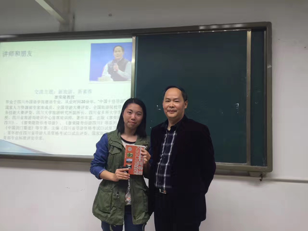 随后,廖荣隆结合自己三十年的导游职业经历,用一个个小故事分享了导游职业对个人基本素养的提升,肯定了同学们选择导游职业的正确性。全国优秀导游张岚则针对景区专业,分享了自己从三星堆的一名景区讲解员转变为一名出境游领队的经历,并告诫同学们在就业时不要过于局限,旅游行业的未来有无限的可能。