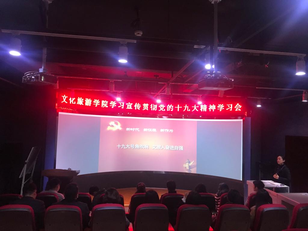 11月20日下午,我院在明道楼8楼环幕厅召开了以“十九大号角吹响,文旅人奋进自强”为主题的党的十九大精神学习会。会议由我院党总支书记、院长黄萍主讲,全院教职工参加了此次学习会。