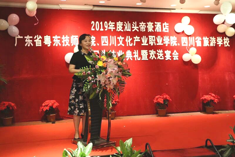 黄萍一行先后与汕头帝豪酒店、深圳五洲宾馆、东海朗廷酒店的总经理、人力资源总监等进行了深入交流。合作酒店方对院方深入企业表示欢迎,对文旅学院学生的实习表现给予充分认可。黄萍代表学院感谢合作单位对学生的关心和培养。双方就实习生管理、学生职业发展与引导、现代学徒制试点和订单培养、行业发展趋势与专业建设等问题深入交换了意见。校企合作单位还为我院实习生举办了隆重的实习结业典礼,为实习学生颁发了实习结业证书。