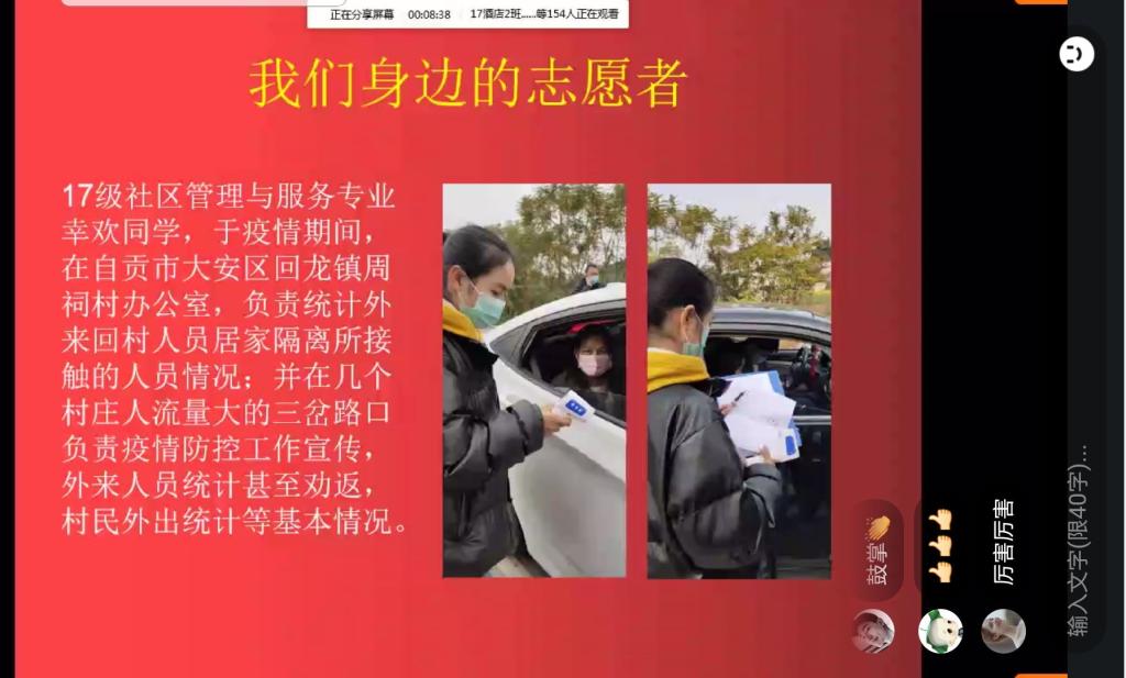 在这“特殊假期”召开的“特殊班会”上,同学们都在直播平台上踊跃发言,共同为武汉加油,为中国加油。表示在家学习也会严格要求自己,会尽自己所能为这场战”疫“的胜利做出自己的贡献,争做有担当、有作为的新时代大学生。