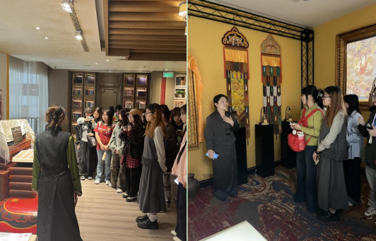 西藏饭店作为业界知名的藏文化主题酒店,为同学们提供了一堂生动的“行走的课堂”。活动以“沉浸式体验”为主线,同学们依次参观酒店主题大堂、特色客房、藏式茶室、餐厅及文创展示区,全面了解其运营模式与文化创意融合路径。从宏伟的藏式门楼到精美的唐卡壁画,从色彩象征到空间布局,酒店每一处细节均体现出浓厚的雪域风情与深厚的文化积淀。在工作人员的细致讲解中,同学们以专业视角深入观察,从“参观者”转变为“探索者”,沉浸式感受主题酒店在文化表达与环境营造方面的独特魅力。