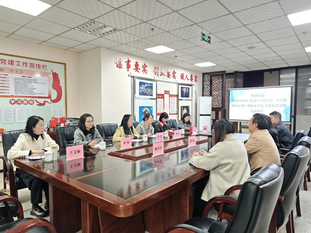 11月11日,四川职业技术学院数字文旅学院院长罗莹率各专业主任、实训中心主任一行6人来我院座谈交流,重点调研我院在智慧旅游技术应用专业建设与学生技能大赛训练方面的实践经验。我院专职组织员梁中正、副院长黎玲出席座谈,智慧旅游技术应用专业负责人陈卓菲、实训室负责人张锋铭参加交流。