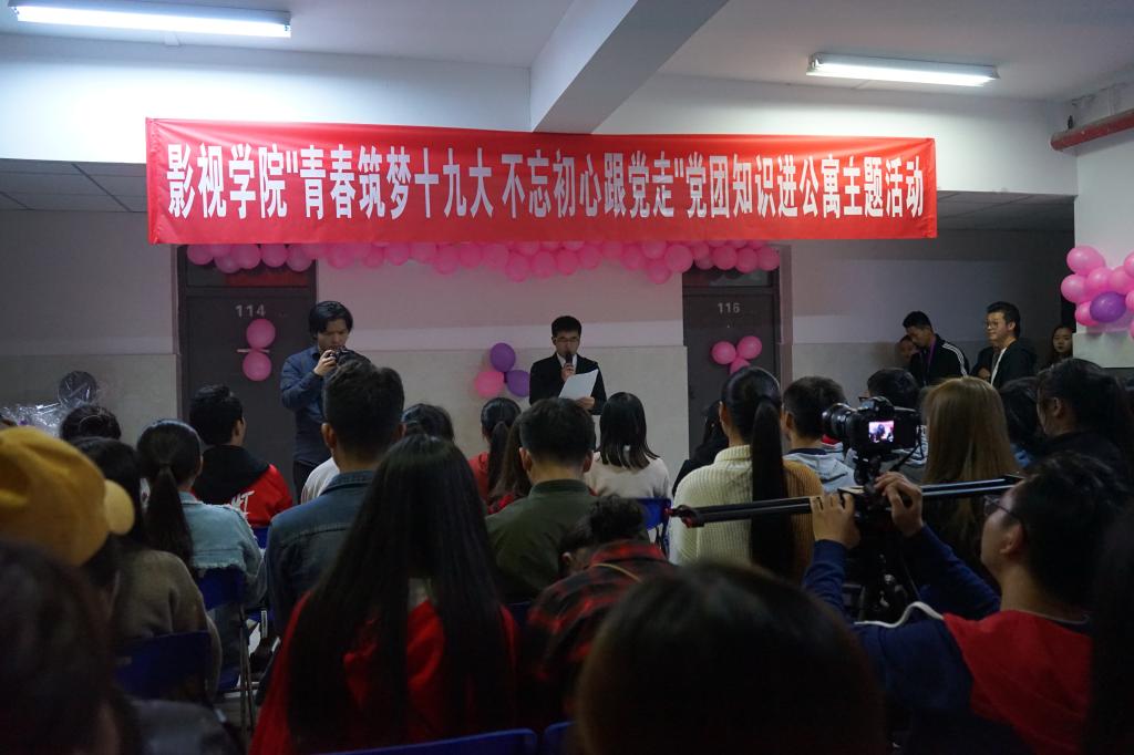1月8日下午,影视学院学生党支部携手公寓团总支在女生公寓十三栋开展了主题为“青春筑梦十九大不忘初心跟党走”的党团知识竞赛活动。学生党支部书记、分团委书记杨维,分团委副书记刘茂林、全体辅导员、团学干部代表以及各寝室代表100余人参与了活动。