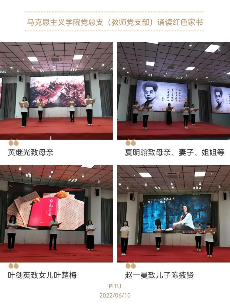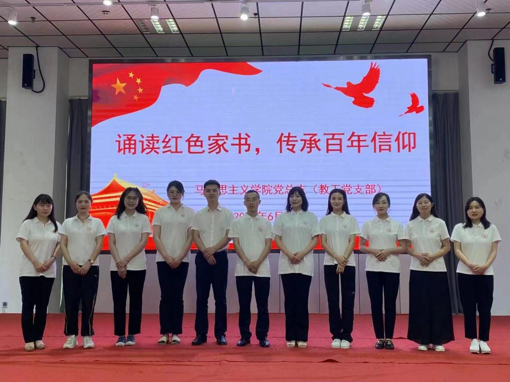 6月10日下午,马克思主义学院党总支(教工党支部)开展“诵读红色家书 感受信仰力量”的诵读家书活动。此次活动中,党总支以青年学习小组为基础组成四个团队,选择了叶剑英致女儿叶楚梅、黄继光致母亲、赵一曼致儿子陈掖贤、夏明翰致母亲、妻子、姐姐等革命先烈的家书进行诵读。伴随着场景图片、背景音乐、事迹介绍和声情并茂的朗诵,党员老师们沉浸式体验了革命先烈的英勇顽强、无私奉献,深刻感受了红色家书的感染力。