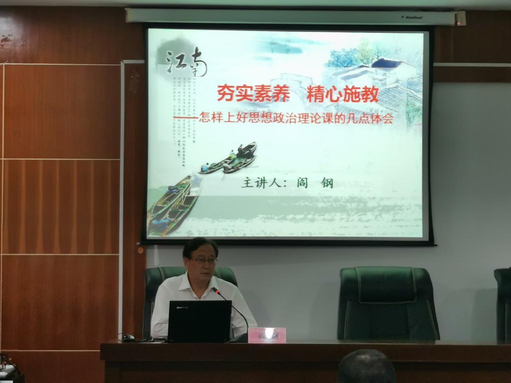 随后,阎钢教授以《夯实素养精心施教——怎样上好思想政治理论课的几点体会》为题作专题讲座。阎钢教授结合自己参加的2019年3月18日召开的全国学校思想政治理论课教师座谈会、亲身聆听习近平总书记讲话的学习心得,提出新时代教师上好思想政治理论课的三点体会。一是站位要高,情怀要深,做学生为学为事为人的大先生;二是敢于直面问题,捋顺课程逻辑,把握好科研与教学的双重关系;三是要因人因事施教,精心备课,以小见大,认真讲好每一堂课。他指出,作为思政课教师,要有坚定的政治信仰,只有自己信仰坚定,才能真学、真懂、真信。