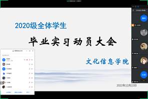 2022年12月22日下午,文化信息学院2023届毕业生实习动员大会于线上腾讯会议召开。文化信息学院院长罗环敏、党总支副书记糜娜、毕业班专业主任、毕业班辅导员陈虹森、校内指导老师及实习学生参加了此次会议。
