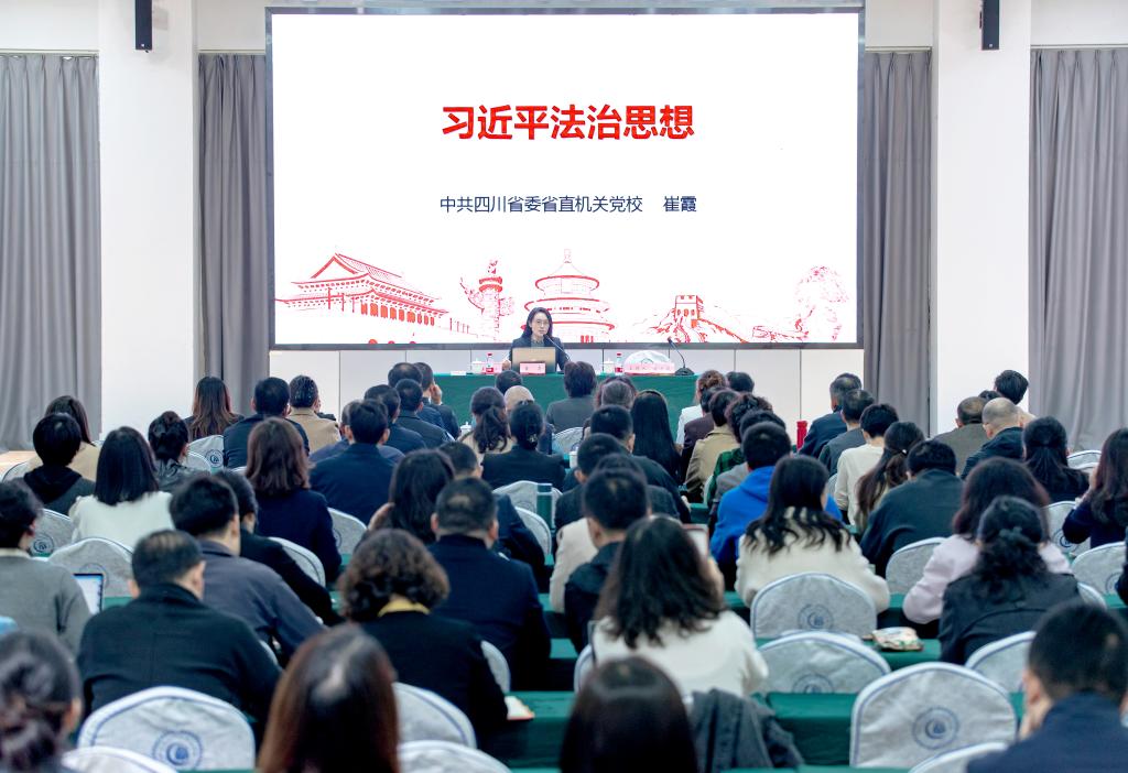 11月8日,我校召开2024年第六次党委理论学习中心组学习(扩大)会议,围绕学习贯彻习近平法治思想开展专题学习,并交流研讨。校党委书记何迎晓主持会议。会议邀请中共四川省委省直机关党校科社·法学教研部副主任、教授,四川省法律人才专家库专家崔霞作《习近平法治思想》专题辅导报告。
