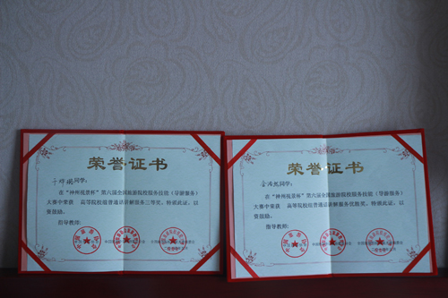 5月12日,文化旅游学院10级旅游管理专业学生干烨璐、金浩然在旅游管理专业负责人黎玲、实训老师谢敬凤的带领下,前往广西桂林参加“神州视景杯”第六届全国旅游院校服务技能(导游服务)大赛,此次大赛共有来自全国的354家旅游院校的953名选手参加,我院的两名学生经过多日准备,在学院专业老师的精心指导下,在此次大赛中表现出色,脱颖而出,一举斩获全国三等奖的荣誉,体现了我院学生扎实的专业技能和出色的比赛水平,为我院挣得了荣誉,可喜可贺。