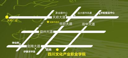 2、 公交:请在火车南站搭乘815路公交车,在省文产院站下车,右转第一个路口前行500米即到达学校。如果在华阳客运中心站下车,可乘坐2B公交车在终点站下车。3、 自驾:请参考地图,或使用GPS导航搜索“四川文化产业职业学院(华阳校区)”。行驶路线:进入成都绕城高速后驶入G4201/s4/成自泸高速方向,沿成都绕城高速行驶2.7公里后,从天府大道、会展中心出口离开,进入锦城大道行驶至华阳欧尚,前行1000米,到金色校园广场路口右转500米到达终点。